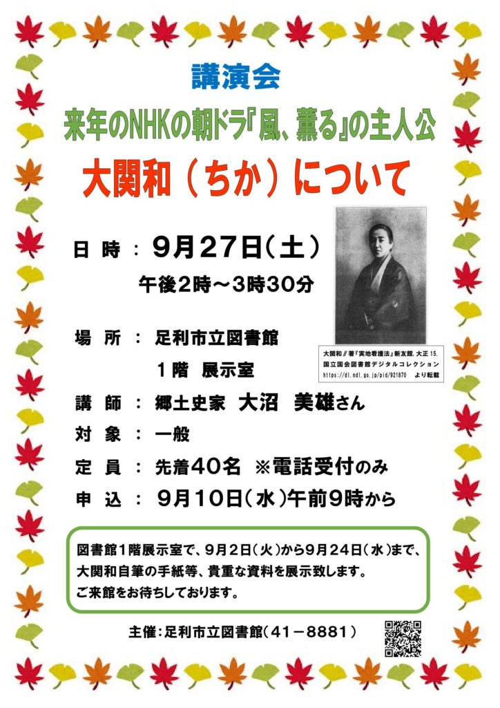 足利市では、右のお知らせのように9月27日に「大関和について」の講演会を催します。